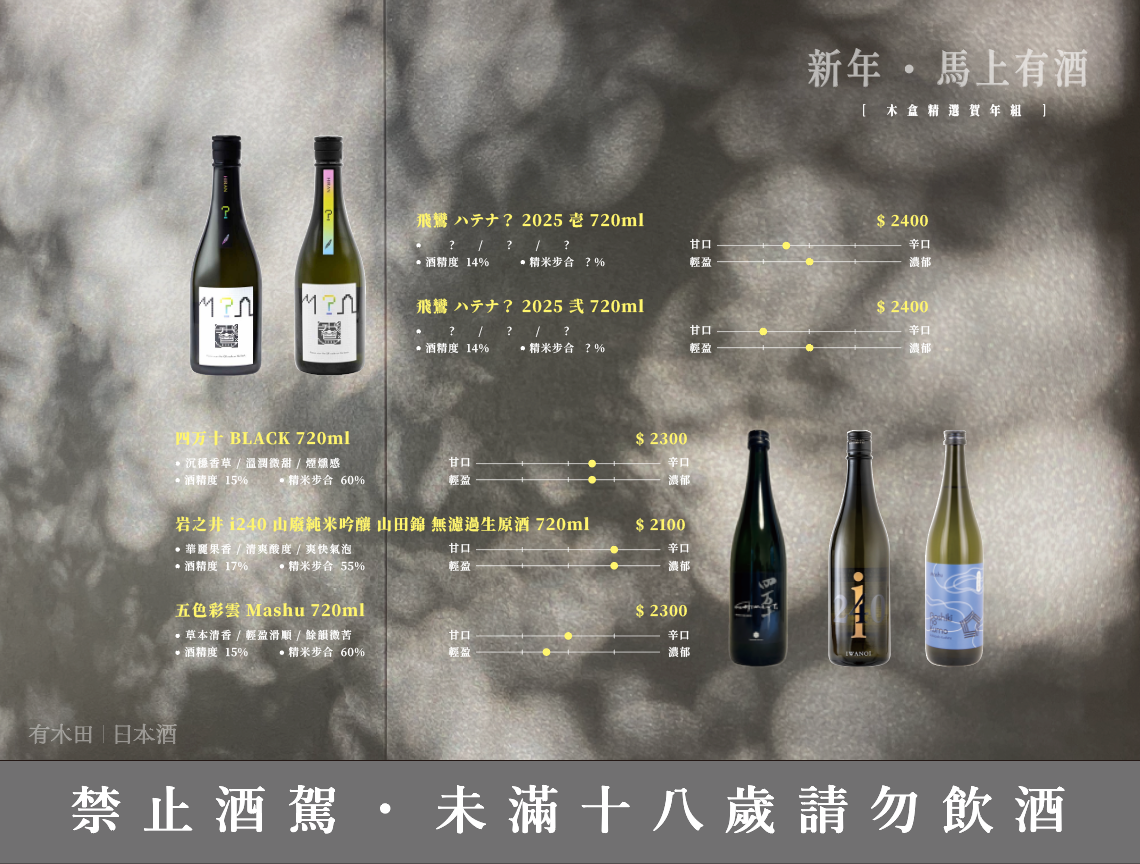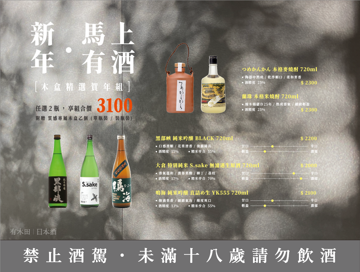 有木田|日本酒最新消息新年馬上有酒・木盒精選賀年組1/24 - 2/28 新年馬上有酒・木盒精選賀年組新年馬上有酒・木盒精選賀年組 1 / 24 - 2 / 28指定清酒,任選雙瓶 即享優惠組合價 3100元(原價平均 4,000–4,800) 附贈 質感專屬木盒 乙個 (可擇一 單瓶裝 或 雙瓶裝)